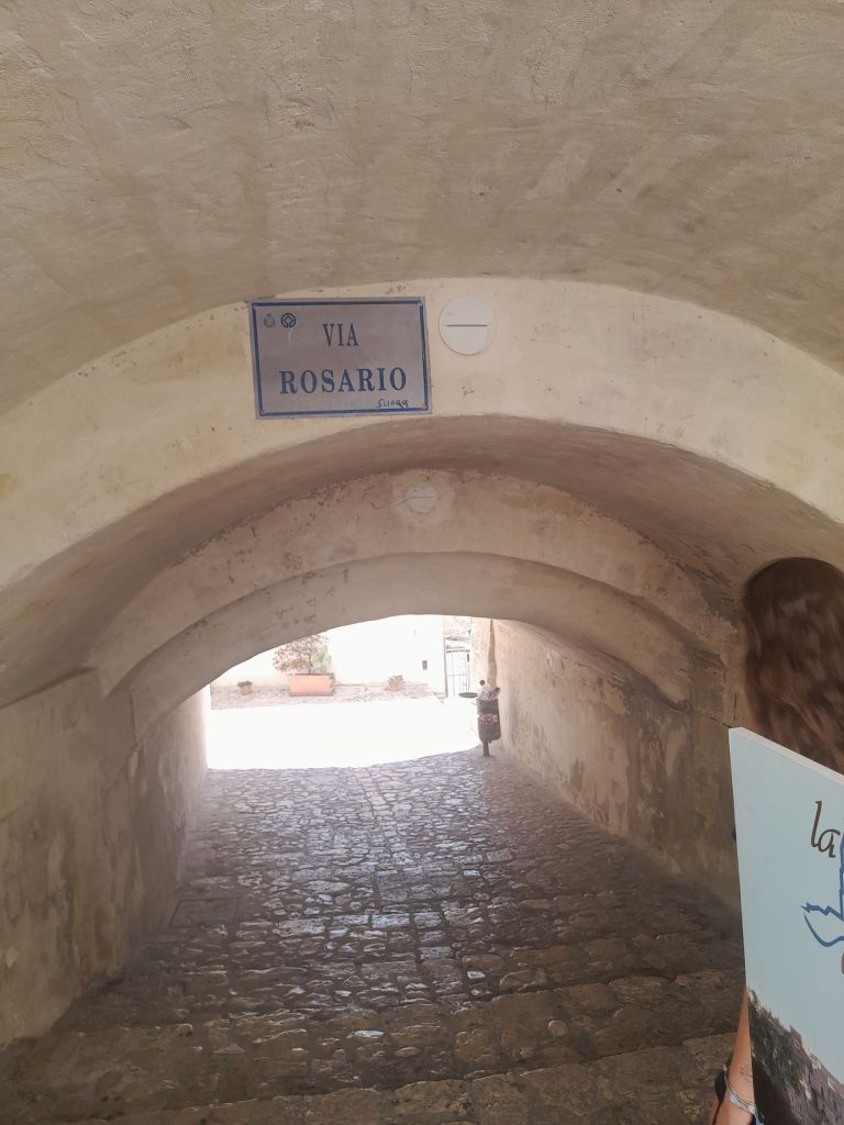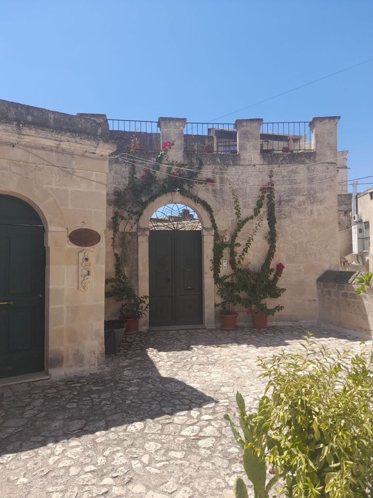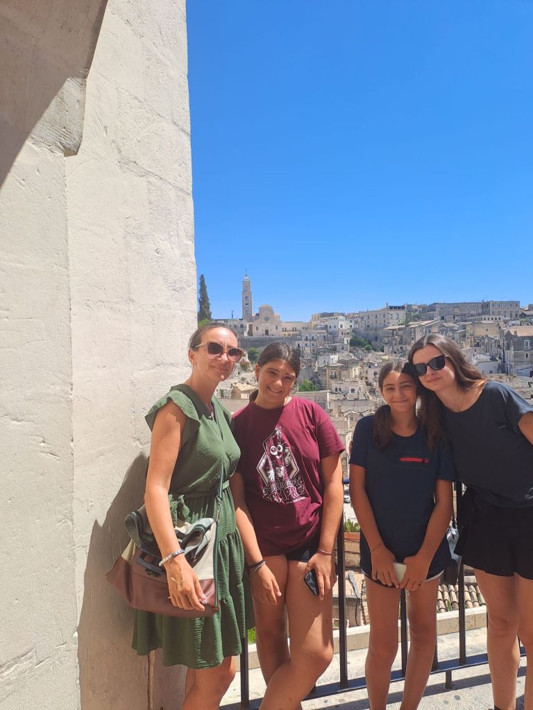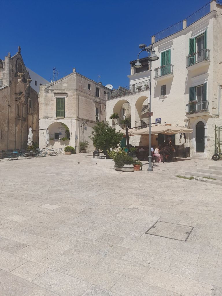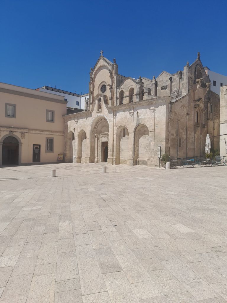 Sole a picco su case, piccole chiese e grandi pietre, quaranta gradi all’ombra. Case e ristoranti e piccoli ristori, creati nella roccia; la parte della città più recente si mescola con quella antica. Il colore bianco, che fa coppia fissa con l’azzurro del cielo, ti riempie gli occhi. Delle nuvole, neanche un abbozzo lieve. Turisti tanti, ma c’era posto per tutti. Era un tanto ordinato, credo di non averlo mai visto prima. Forse per il fatto di essere andati, il giorno 12 di agosto, in una città senza mare. Tolgo il forse, è così. Sorseggiando un caffè riesci ad ascoltare, contemporaneamente, lingue diverse, che si mescolano, in un incessante susseguirsi di risate e suoni sconosciuti. E, tra quelli, mi scoprivo sorpresa a udirne qualcuno di già conosciuto. Come quella famiglia, seduta al tavolo di fronte al nostro, nel bar della piazza centrale, che parlava spagnolo; o come la famiglia americana, che ha scelto di pranzare nel nostro stesso posto, in piazza San Giovanni Battista. La proprietaria di questo delizioso posticino, che serve piatti tipici, si chiama Imma, come la omonima protagonista della fiction, girata proprio nella piazza medesima; dove noi abbiamo sbocconcellato il nostro delizioso e fresco pasto, allietando i nostri palati con un piatto tipico, la Cialled. Gustoso e semplice, composto da pezzi di pane, pomodori, cipolle, cetrioli e basilico. Le persone del posto sono cordiali, così come lo è stata Imma con noi, così disponibile e sorridente, da farci sentire a casa. Anche il proprietario del ristorante della grotta, ci ha invitato a scendere per andare a vedere la vista dalla terrazza. Che dava sulla parte antica, di struggente bellezza. Un’altra scoperta curiosa è stato apprendere che qui il melone è l’anguria. Quindi, se lo ordini, ti portano quello rosso e non quello arancione. Nel nostro viaggio verso casa, Matera è stata una sosta scelta, prima di partire. Città bella fra le belle, capace di sopravvivere al tempo e di conservarne, intatta, la storia e la tradizione; essa possiede una capacità rara, quella di fartene innamorare perdutamente.